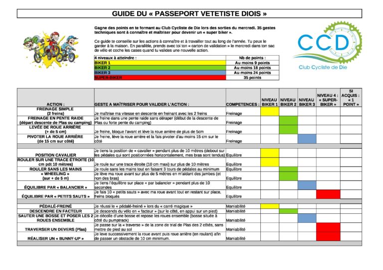 En 2023, nous lançons officiellement le » PASSEPORT VETETISTE DIOIS » qui vise à permettre aux jeunes du Club Cycliste de Die de mieux connaître leurs niveaux techniques en vtt.